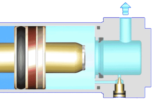 缓冲腔内的气体只能通过缓冲阀排出。当缓冲阀的开度很小时,腔内压力快速上升,该压力对于活塞产生反作用力,从而使活塞减速,直至停止。